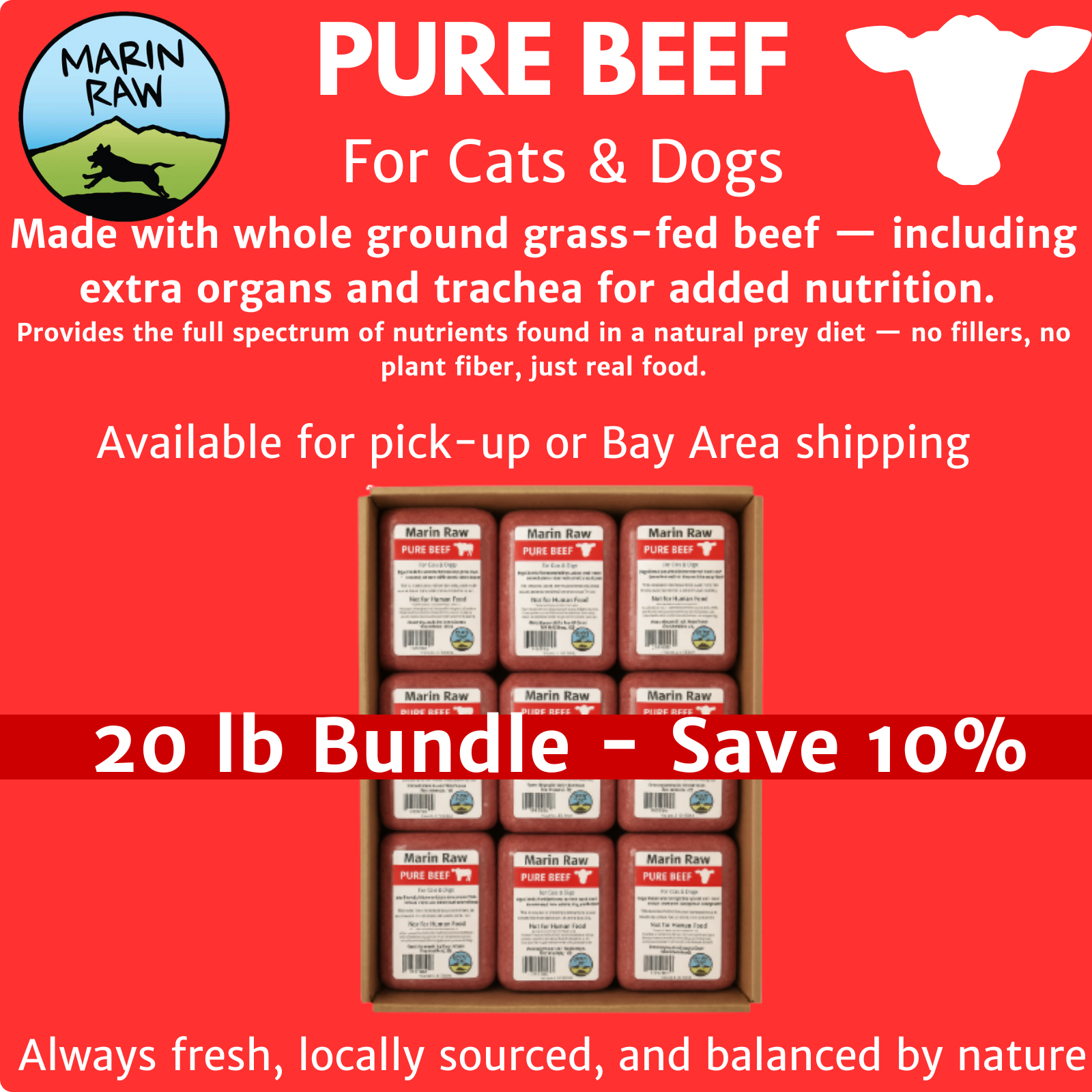 Our Whole Ground Beef is crafted to reflect the balance of a true prey-model diet — made from grass-fed beef muscle meat and nutrient-rich organs, with added collagen-dense parts like trachea, gullet, and connective tissue to deliver the meat fiber dogs need for digestive and immune health.