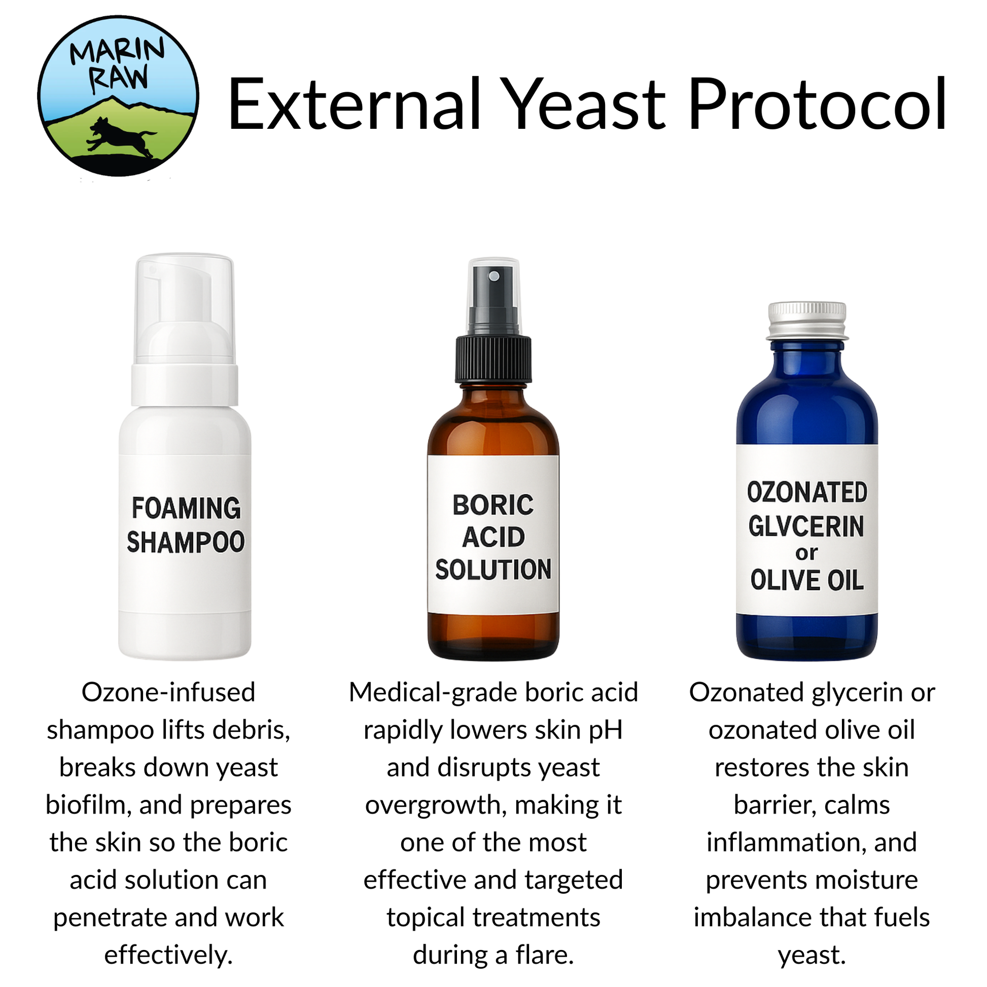 This advanced external bundle is designed for dogs with moderate to stubborn yeast, especially on paws, toes, groin, belly, armpits, skin folds, and outer ears.