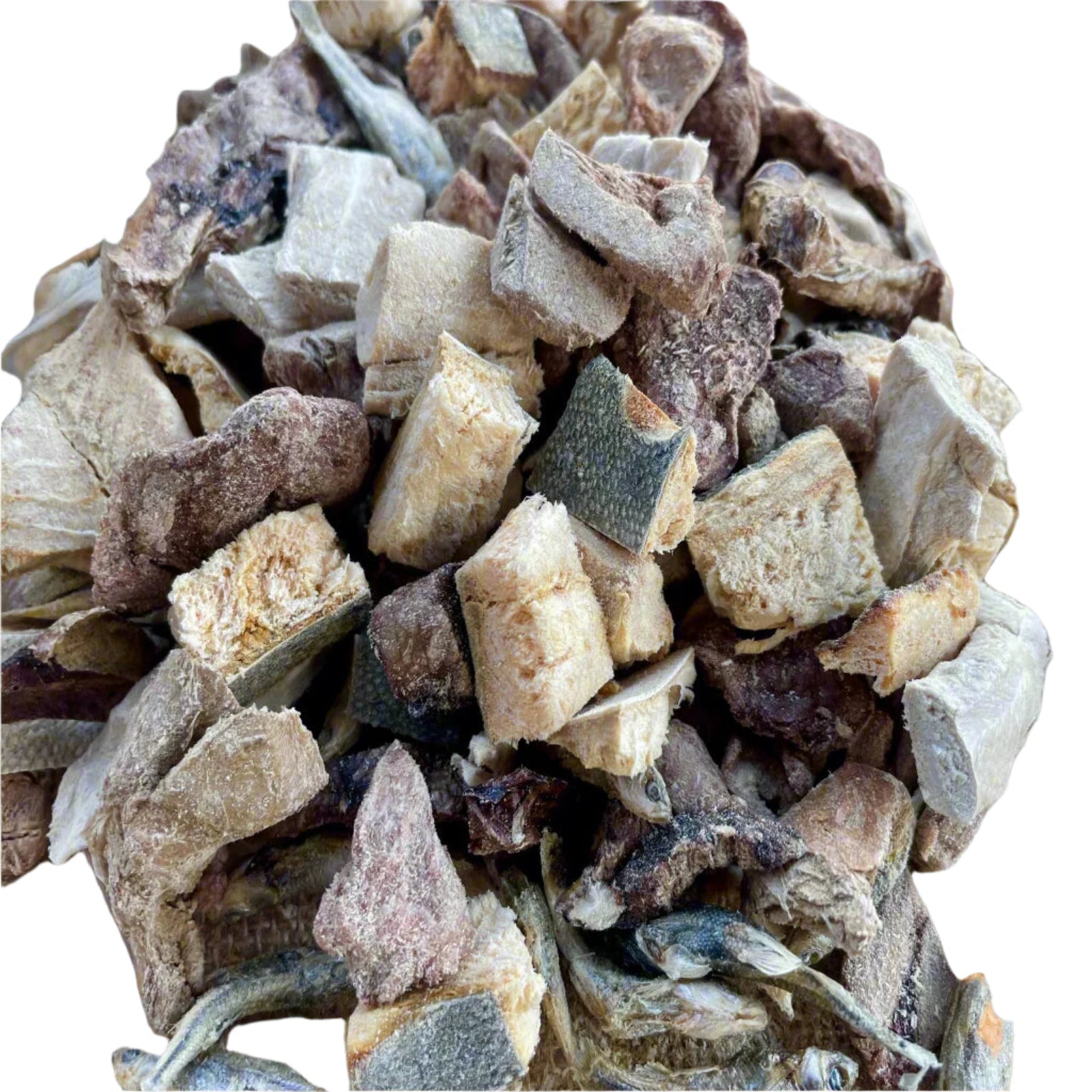 Here Kitty, Kitty includes freeze-dried minnows, shrimp, rabbit liver, rabbit lung, rabbit heart and duck hearts.