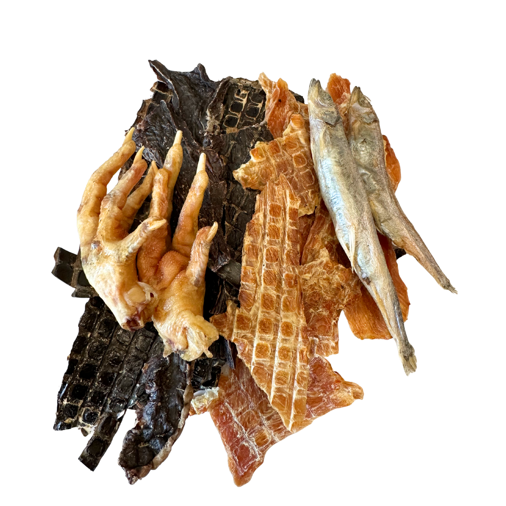 Mix of chicken breast, beef liver, beef heart, chicken feet, capelin