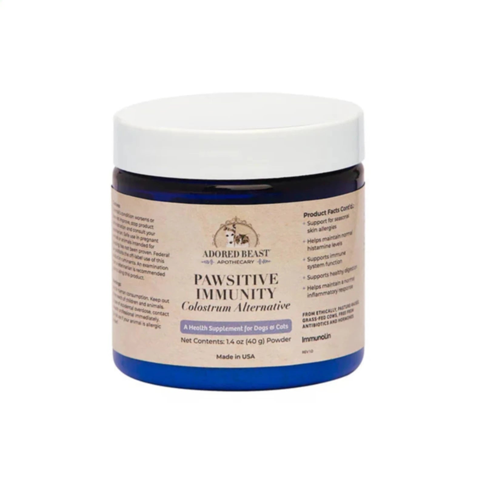 Adored Beast's Pawsitive Immunity is a colostrum alternative supplement for pets, featuring bovine plasma isolate rich in immunoglobulins. It supports the immune system, helps maintain normal histamine levels, and promotes healthy digestion.