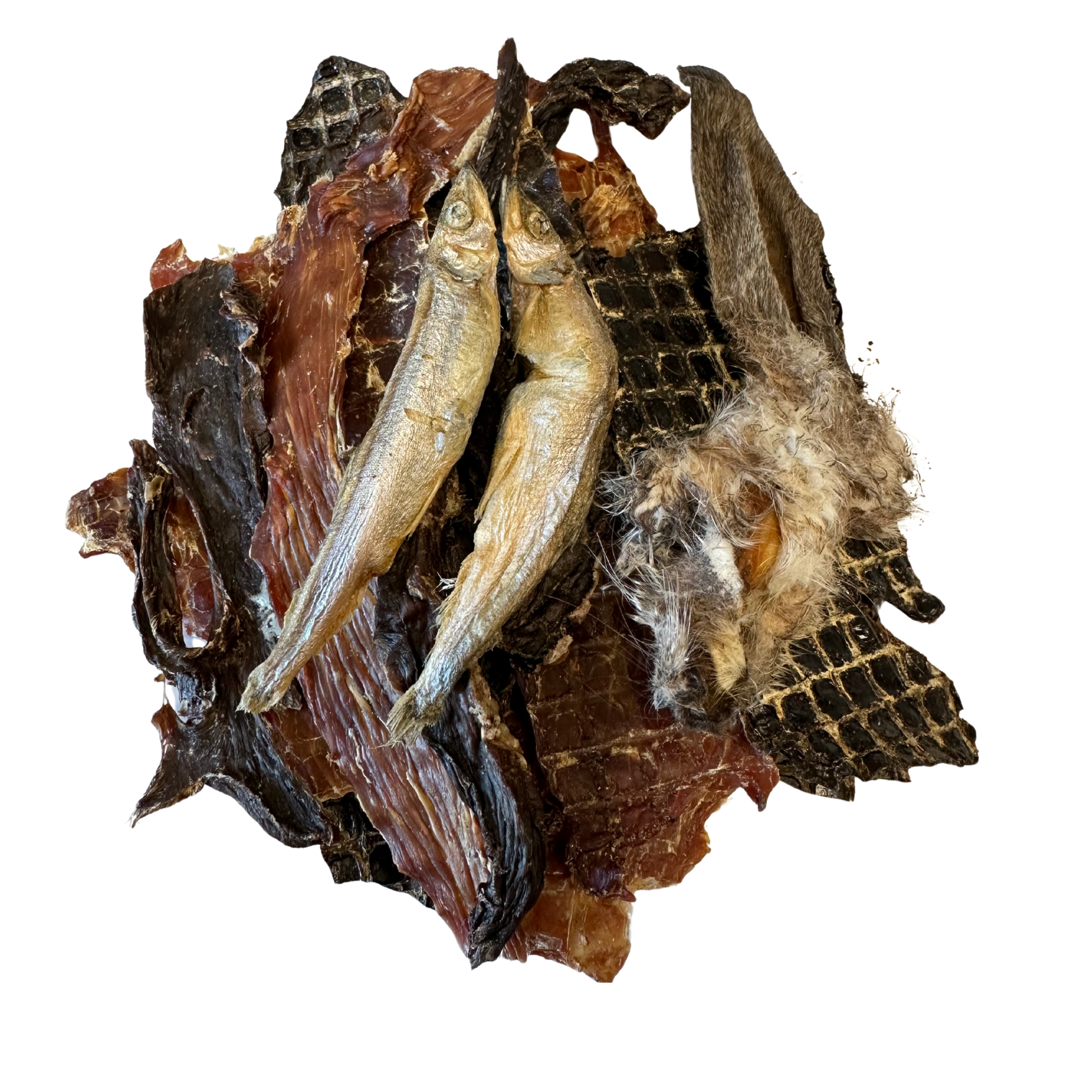 Wiggle Butt includes a rotating mix of capelin, rabbit ear, beef liver, and pork